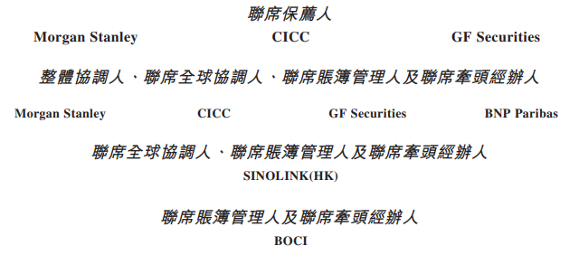 英矽智能的联席保荐人为摩根士丹利亚洲有限公司、中国国际金融香港证券有限公司、广发融资(香港)有限公司,整体协调人、联席全球协调人、联席账簿管理人及联席牵头经办人为摩根士丹利亚洲有限公司、中国国际金融香港证券有限公司、广发融资(香港)有限公司、法国巴黎证券(亚洲)有限公司,联席全球协调人、联席账簿管理人及联席牵头经办人为国金证券(香港)有限公司,联席账簿管理人及联席牵头经办人为中银国际亚洲有限公司。