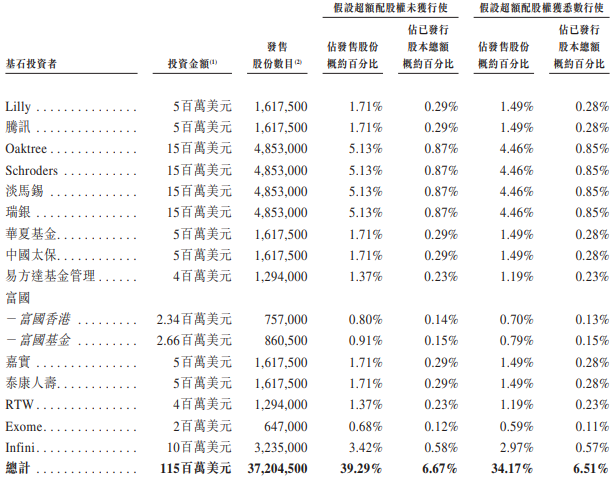 英矽智能的基石投资者为Lilly、腾讯、Oaktree、Schroders、淡马锡、瑞银、华夏基金、中国太保、易方达基金、富国、嘉实、泰康人寿、RTW、Exome、Infini。