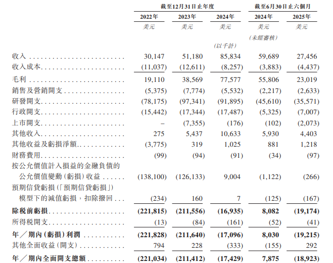 于2022年、2023年、2024年、2025年1-6月,英矽智能的收入分别为30.1百万美元、51.2百万美元、85.8百万美元、27.5百万美元;年/期内亏损分别为221.8百万美元、211.6百万美元、17.1百万美元、19.2百万美元。