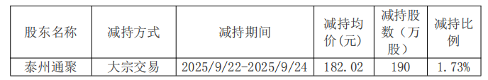 2025年9月22日至2025年9月24日,泰州通聚通过大宗交易方式减持190万股股份,减持均价为182.02元,减持比例1.73%。经计算,泰州通聚套现约3.46亿元。